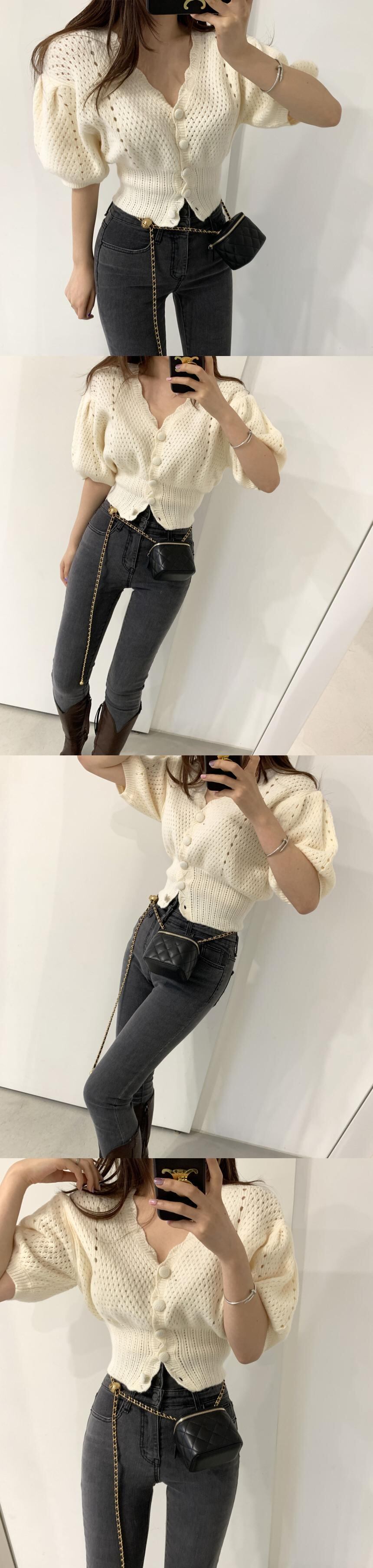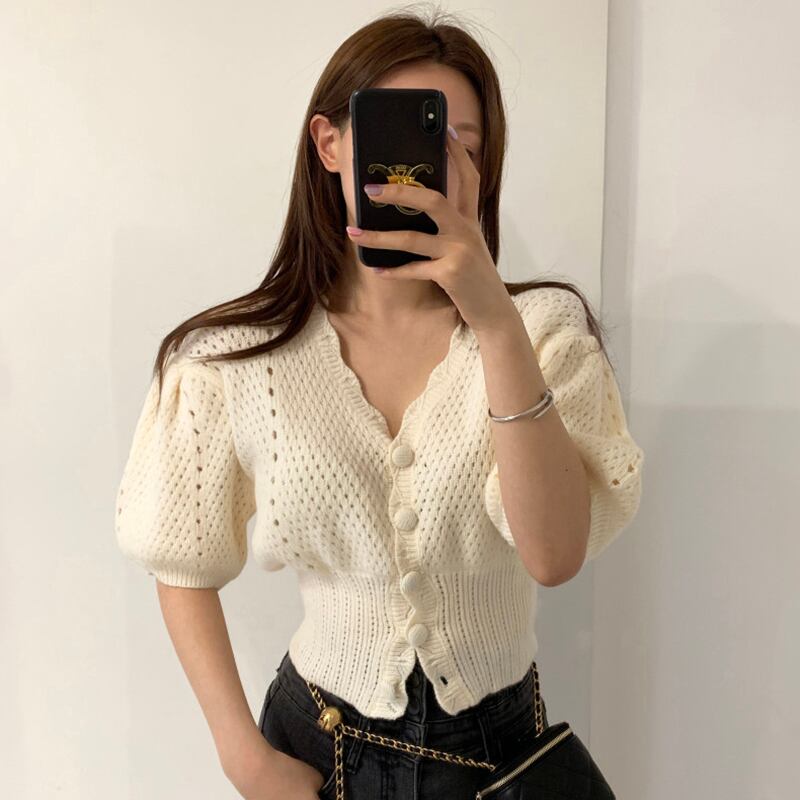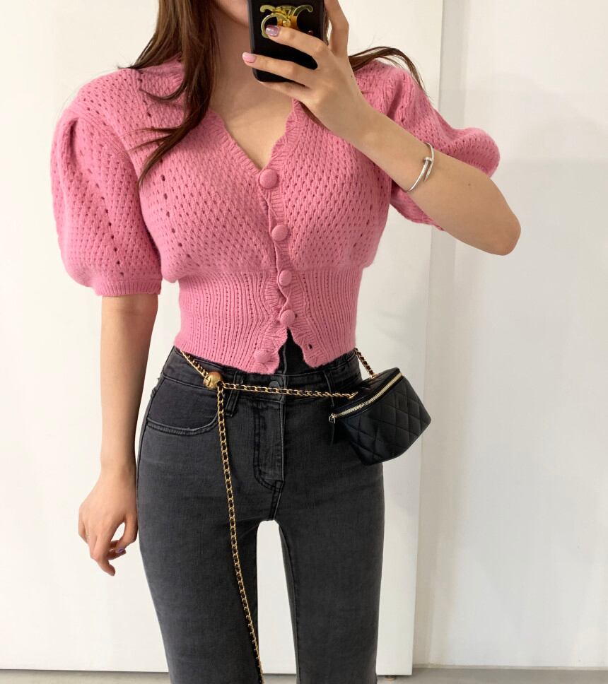 V ネック シングル ブレスト カットアウト スリム フィット パフ半袖セーター女性プル ピンク ジャケット薄いシックな甘いクロップ カーディガン ニット トップ ショート ハーフスリーブ 大人ガーリー スウィート キュート カジュアル asa52389253700