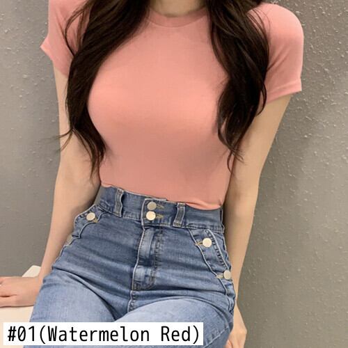 キャンディーカラー弾性 Tシャツスリム O ネック Tシャツ綿半袖 Tシャツ女性スリムクロップトップス Y2k スタイル春 ショート コットン ハーフスリーブ エラスティック 伸縮 スプリング 春物 Oネック asa17804514901