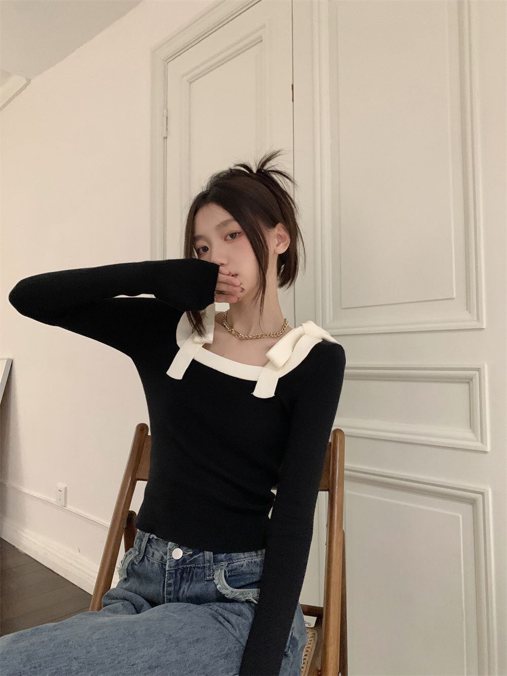シャツ女性ジャージーセータースリムセクシーなクロップトップスレトロスクエアボウブラックセーターニットブラウス春シック リボン スプリング 春物 スクウェア asa82114675344
