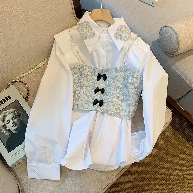 パールジャカードキャミソールトップス+ワークスタイル長袖ホワイト女性シャツ2点セットゆったりブラウス秋 ロング 真珠 asa32474855097