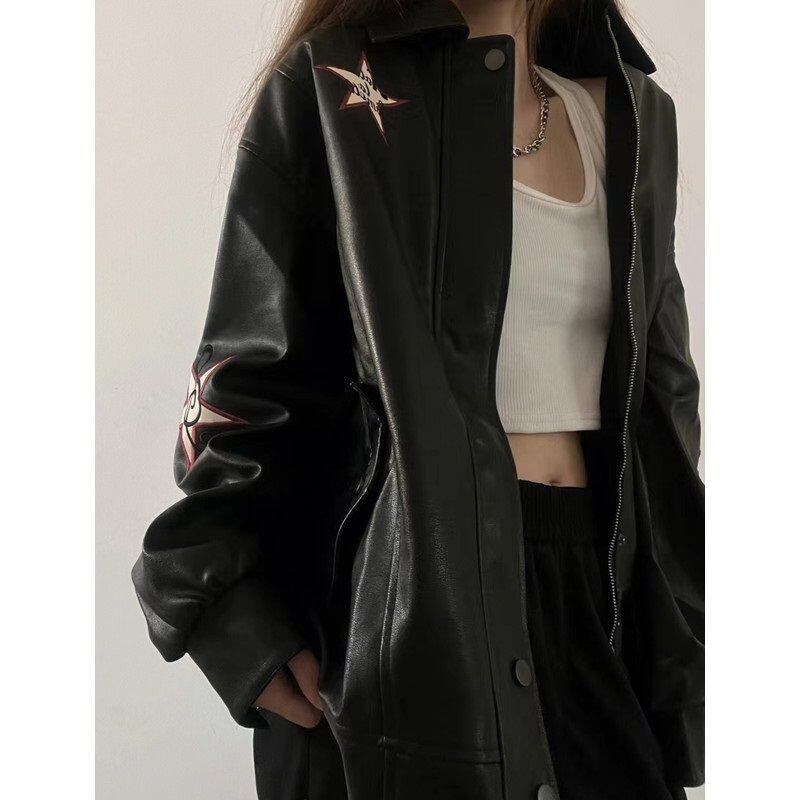 秋アメリカ刺繍レザージャケット女性黒 PU フェイクファーコート手紙 Jaqueta Chaquetas フェイクレザー レッド ブラック オータム 秋物 asa14064593458