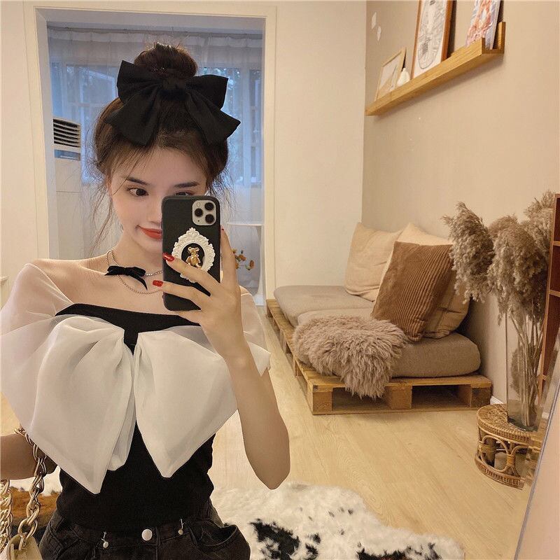 甘いシフォンブラウスオフショルダーコントラスト弓ノースリーブクロップトップス黒 Tシャツ女性スリム Tシャツ女性 ブラック リボン 大人ガーリー スウィート キュート カジュアル asa53067414361
