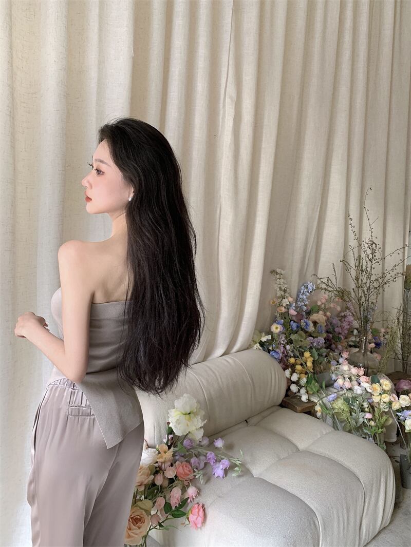 セクシーなストラップレスブラウスラインストーンキャミソールクロップトップススラッシュオフショルダーシャツ女性ワイドレッグサテンパンツビーズシャツ ワイドパンツ asa96777815282