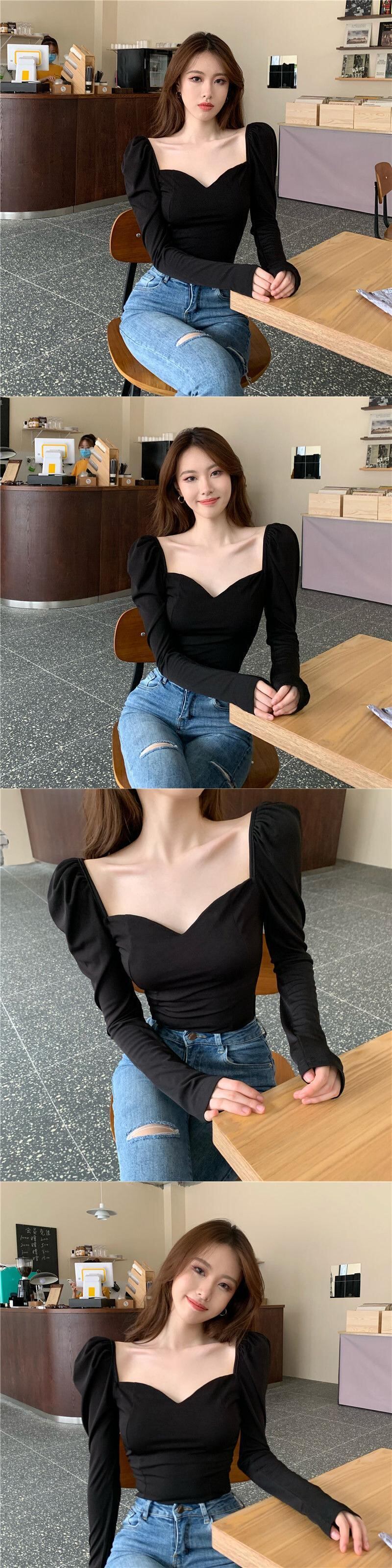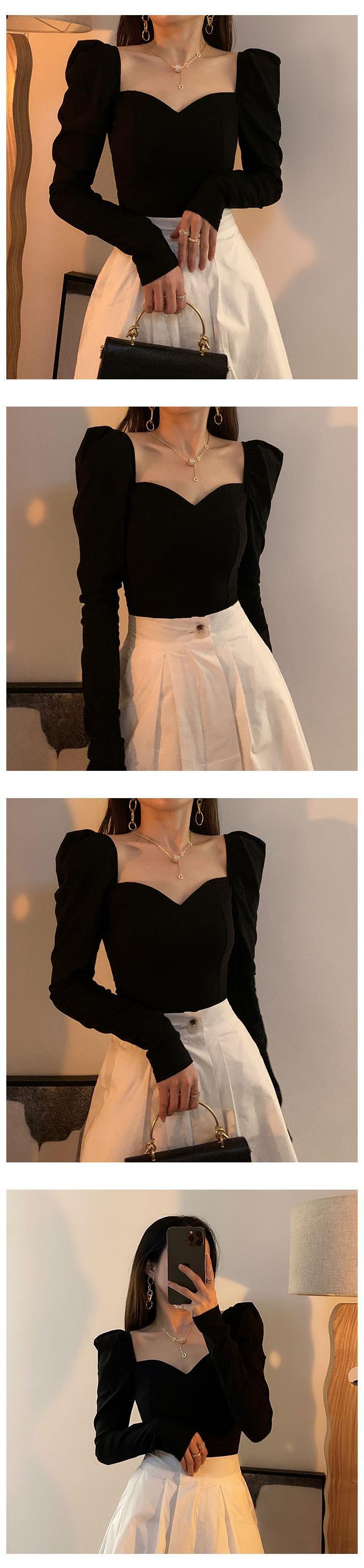 セクシーな黒の Tシャツ女性 Tシャツスクエアカラーパフ長袖レトロ Tシャツスリムトップスシャツ女性 Ropa ロング ブラック スクウェア asa65648090615