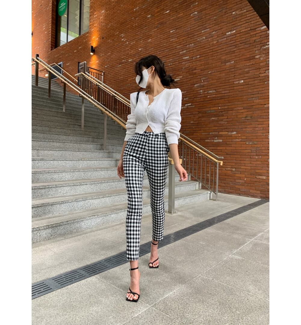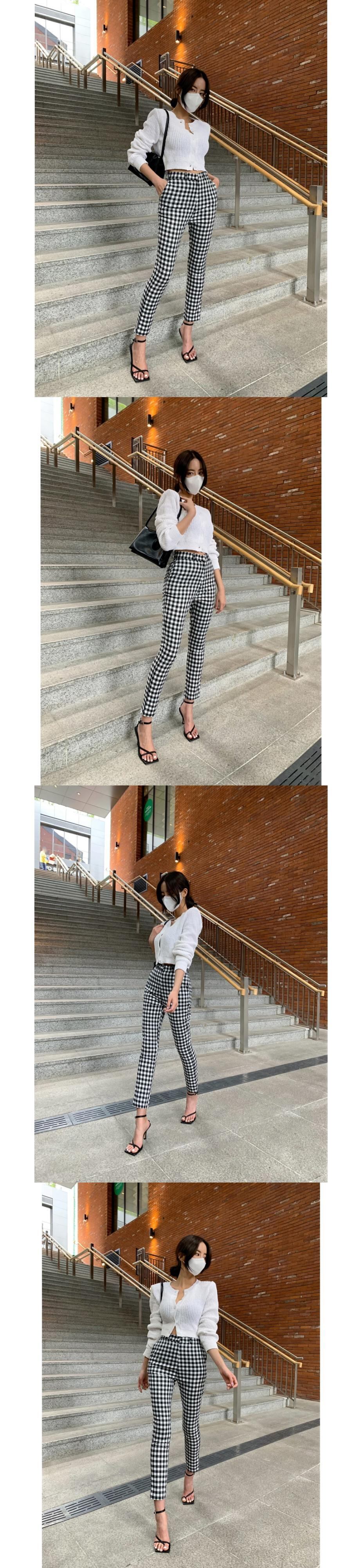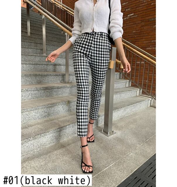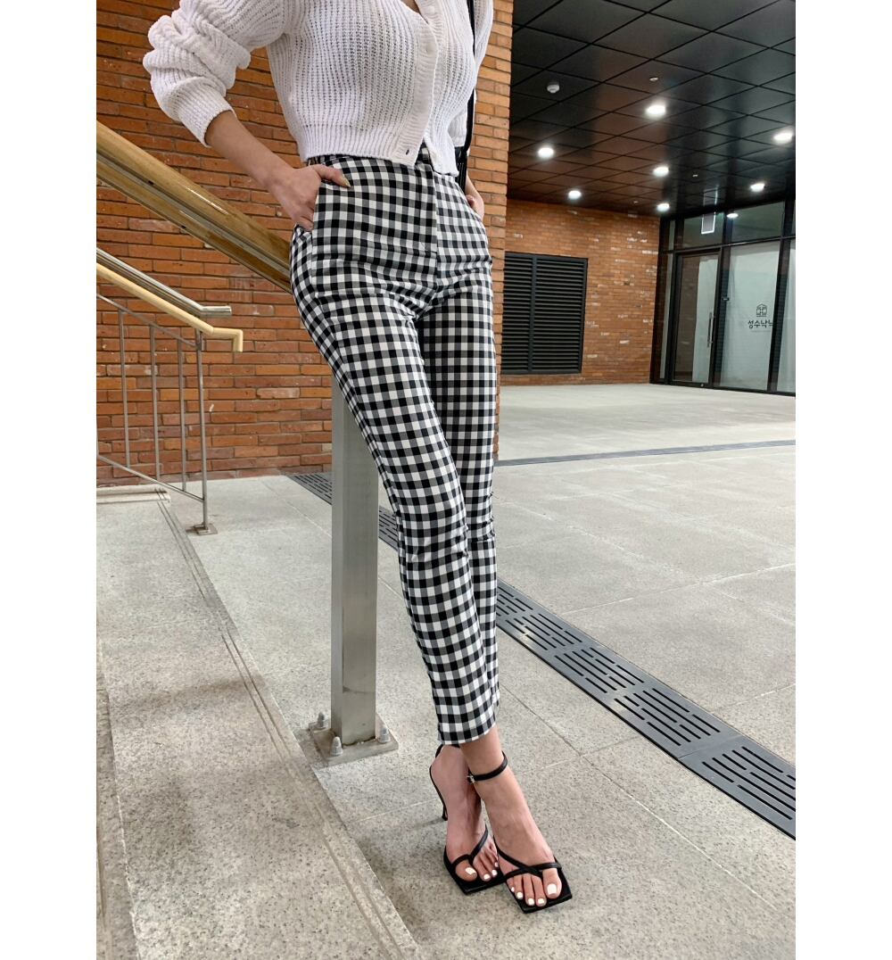 スリム弾性ウエスト黒、白の格子縞の鉛筆のズボンの女性野生 pantalones デストレートワイドレッグボトム ホワイト ブラック エラスティック 伸縮 ワイドパンツ asa31902087065