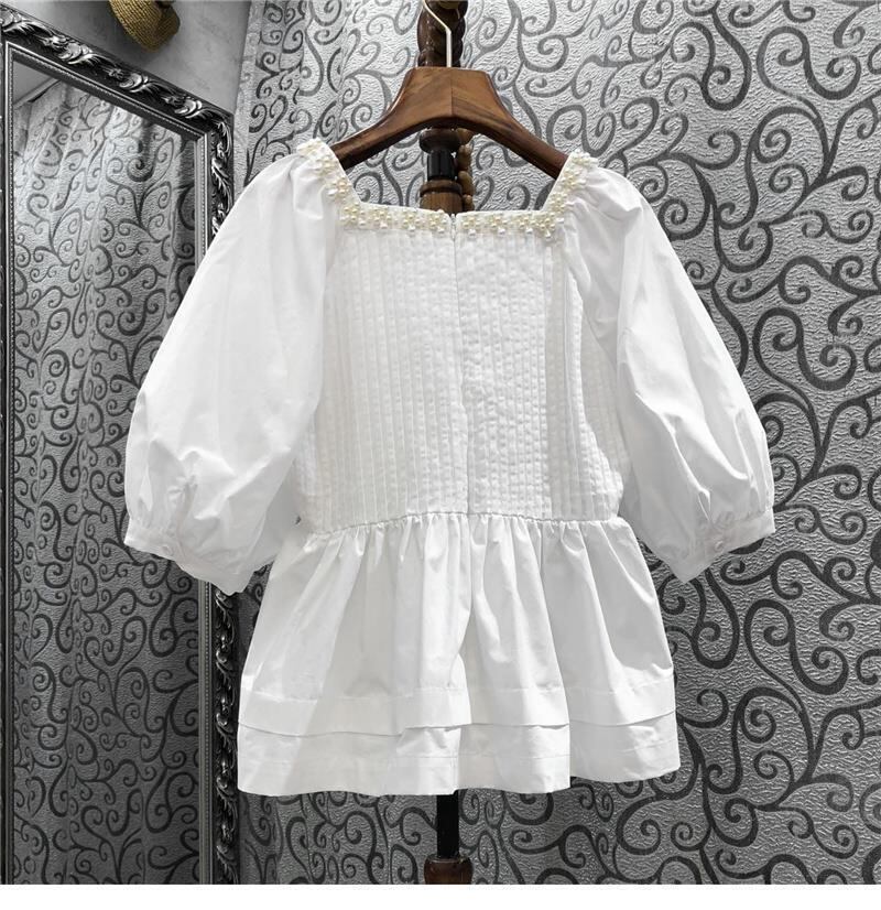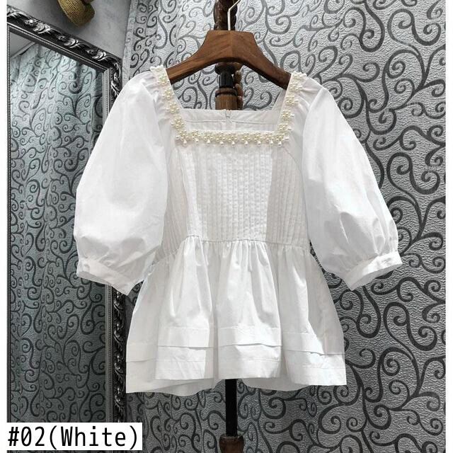 ルーズ パフ半袖パール スクエア シャツ女性トップ春デ ジッパー ブラウス野生の女性のシャツ ショート ハーフスリーブ スプリング 春物 真珠 スクウェア asa24970286192