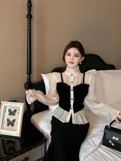 裁判所スタイル真菌黒ベルベットシャツ女性パッチワーク長袖フェイクツーピーストップブラウス女性シャツ ロング ブラック asa87051919131