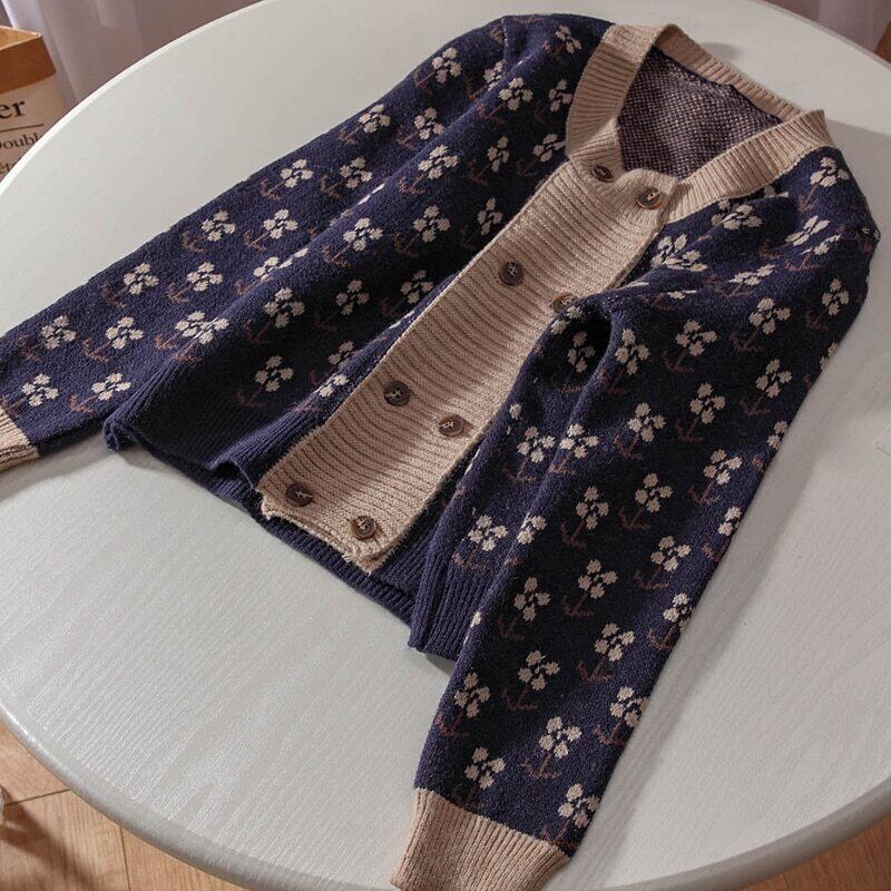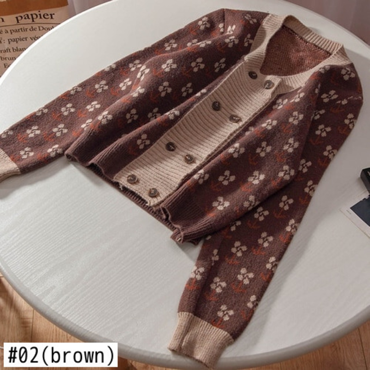 Oネックプリント ヒットカラー カーディガン ゆったり ダブルブレスト ニットセーター フラワー 秋 ジャケット セーター デ オータム 秋物 フラワーデザイン asa63232280855