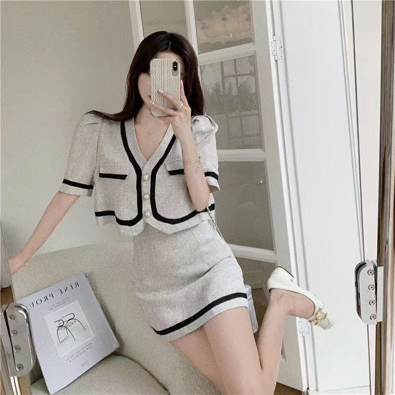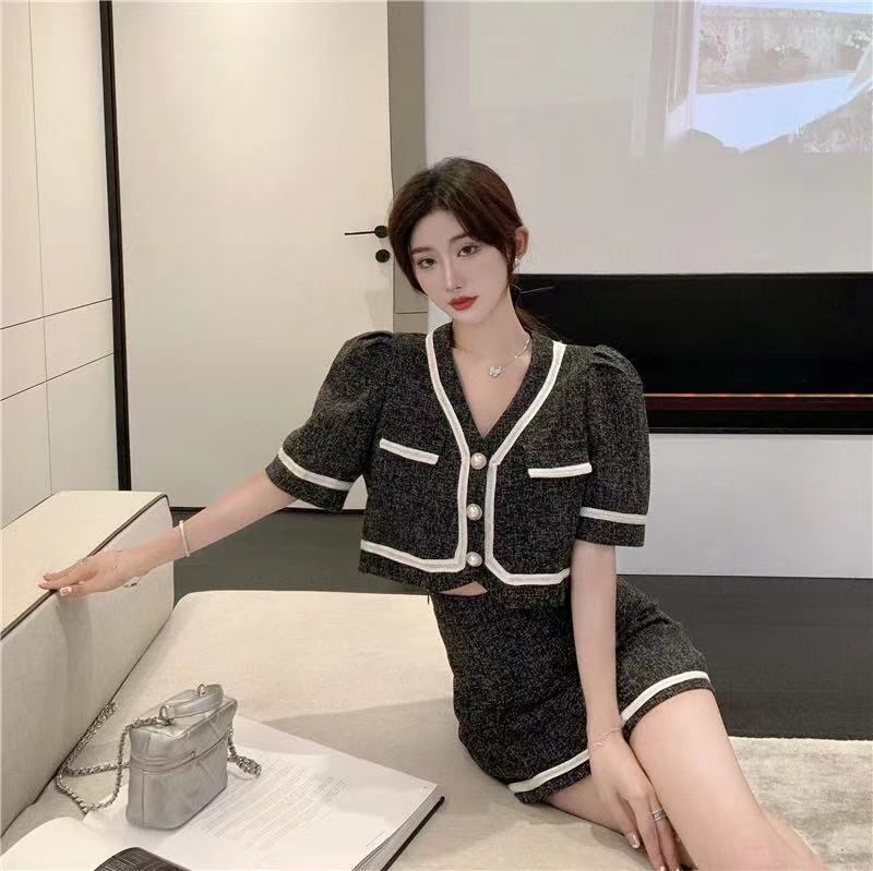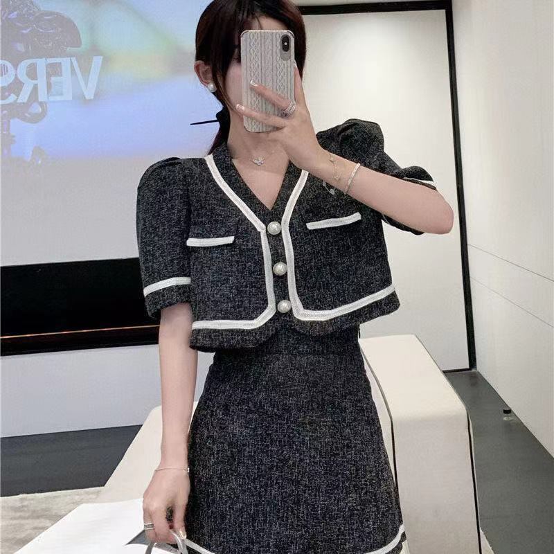 V ネック半袖シャツ女性カーディガンクロップジャケットラップヒップミニ黒スカートレディース 2 peice セットトップスリムブラウス ショート ブラック ハーフスリーブ asa22675644121