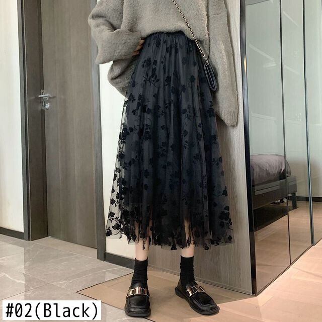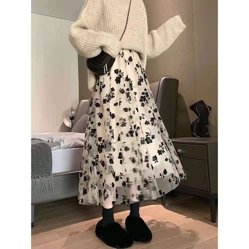ファルダス モーダ ウエスト スリム A ライン妖精黒花柄プリーツ スカート春ガーゼ スカート女性ペチコート レトロ ブラック スプリング 春物 Aライン asa62676722516