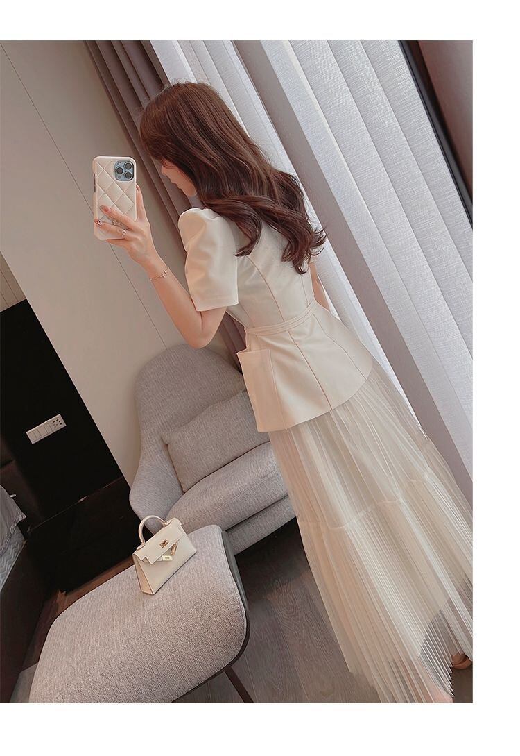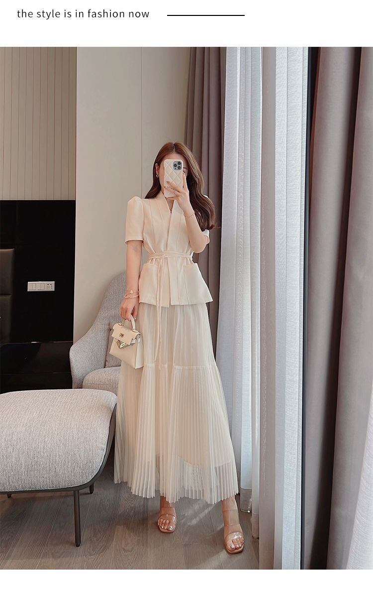 気質V半袖スーツジャケットベルトウエストスリムAラインプリーツスカート春ツーピースセットスタイル ショート ハーフスリーブ スプリング 春物 ハーネス asa41839537416