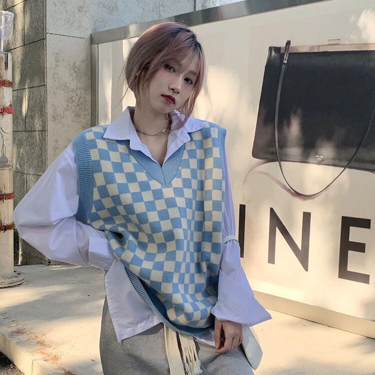 V ネック黒、白チェス盤セーターのベストの女性 Colete Feminino カップル ベスト ニット トップス セーター秋 ホワイト ブラック オータム 秋物 asa63383493049
