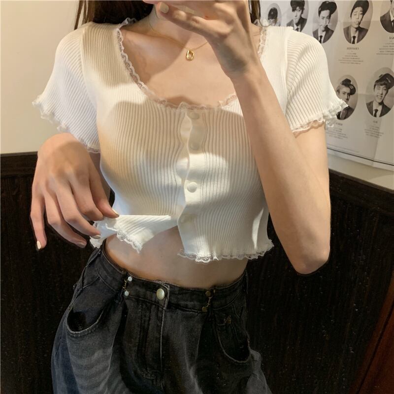 シングルブレストカーディガンスリムクロップトップスホワイトスクエア半袖レースシャツニットシャツ女性 Y2k tシャツ ショート ハーフスリーブ スクウェア asa92491355195