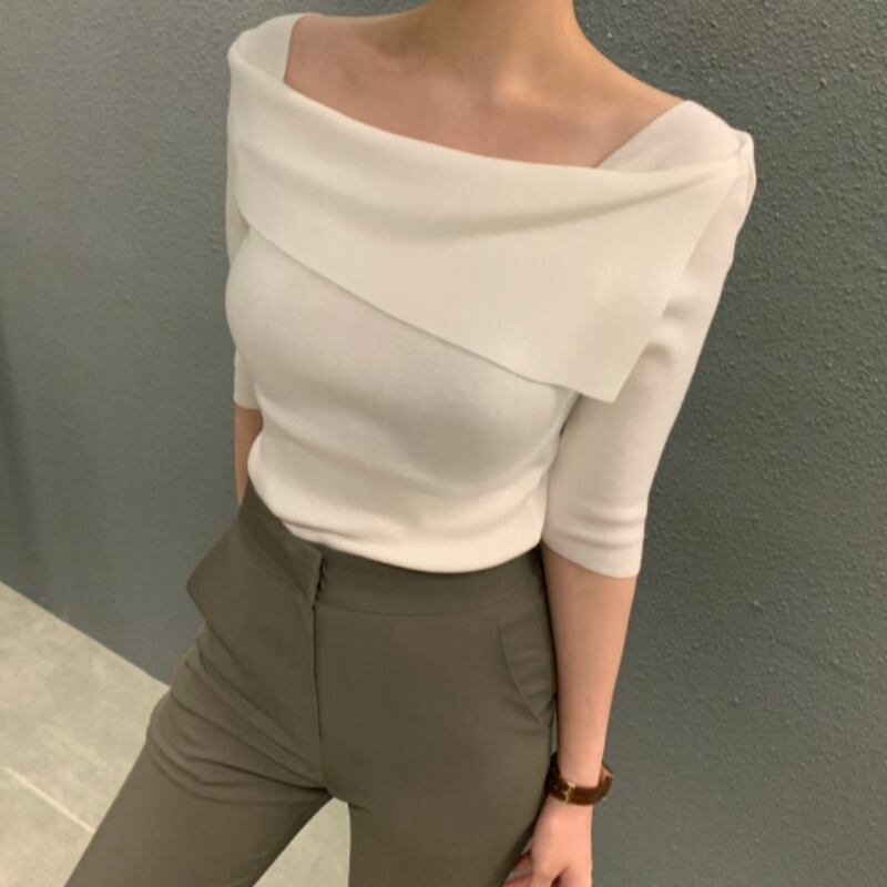 シャツ女性スリムワンショルダーハーフスリーブ Tシャツ女性薄型アイスホワイトトップ半袖黒ニット Tシャツ ショート ブラック シルク asa42804032023
