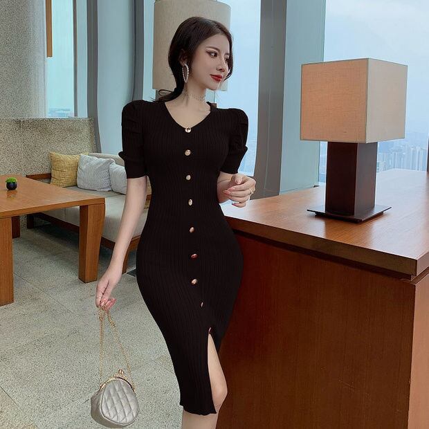 ドレスシングル胸 V ネック半袖ニットドレス女性ラップヒップスリムウエストローブ Vestidos デセーター固体 ショート ハーフスリーブ スリムヒップ Vネック ソリッドカラー asa22558148674