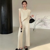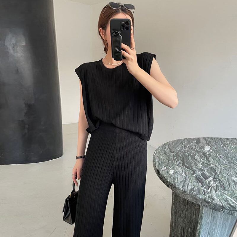 ツーピースセット女性 O ネックベストノースリーブ Tシャツブラウスセクシーなシャツニットトップスウエストワイドレッグパンツスーツ Oネック ワイドパンツ asa66740919410