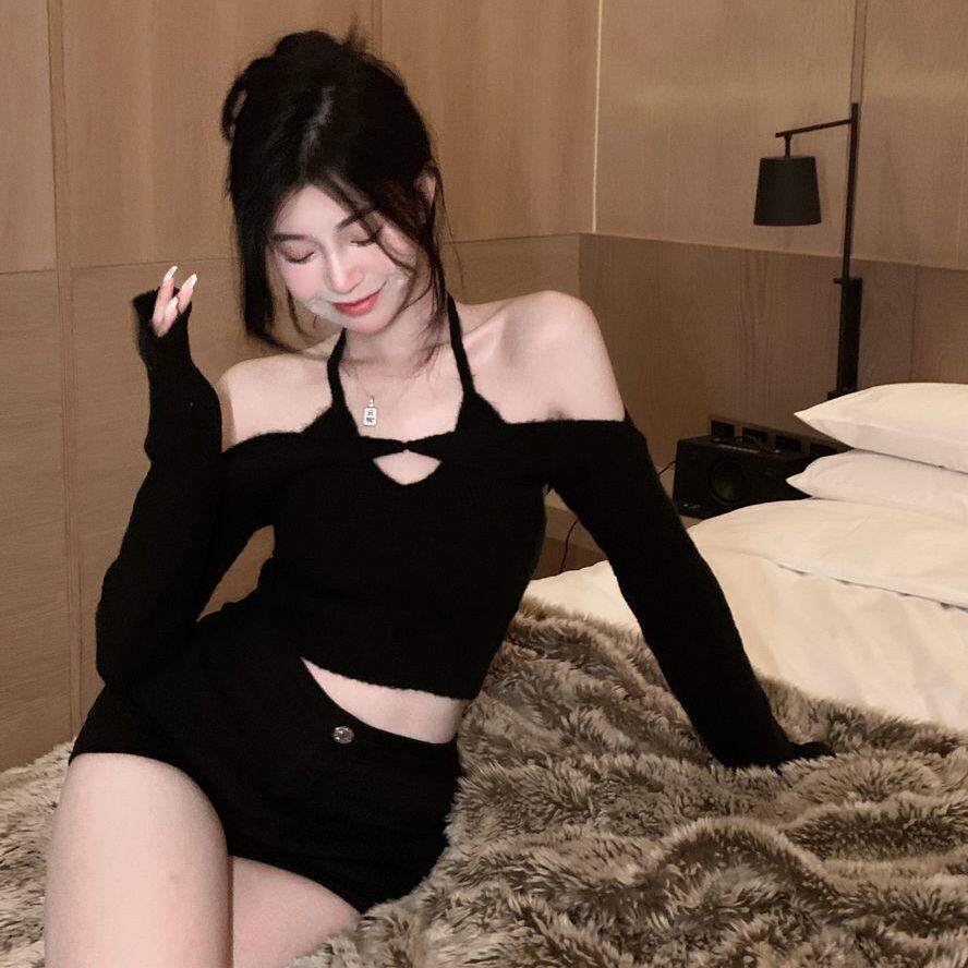セクシーなオフショルダーオールマッチ無地ダブルカラー女性のショートトップ Tシャツクロップトップセーターニット黒スリム Tシャツ ブラック ソリッドカラー asa8073865835