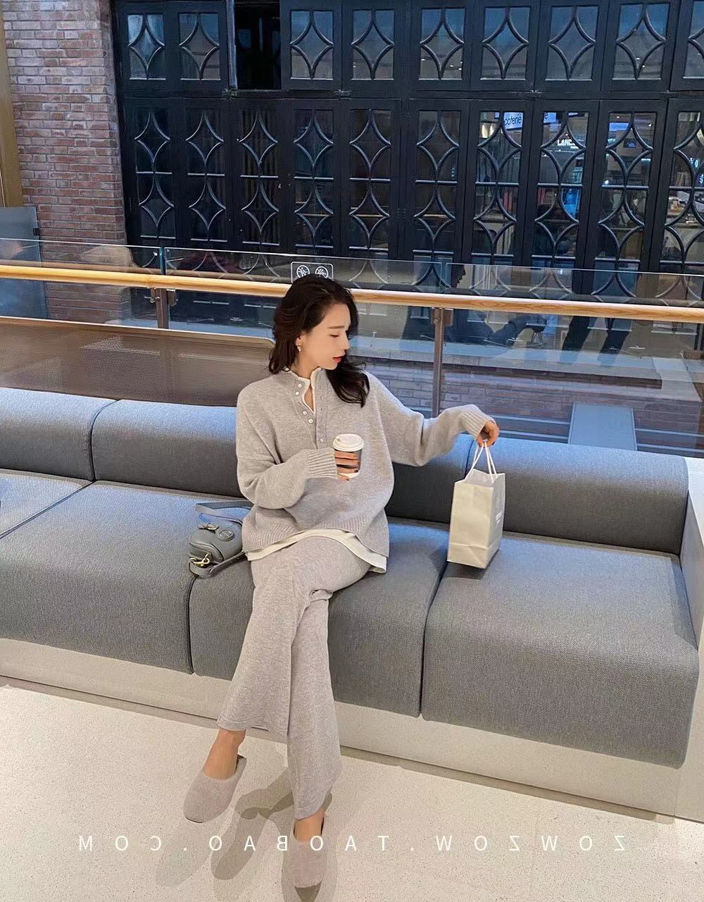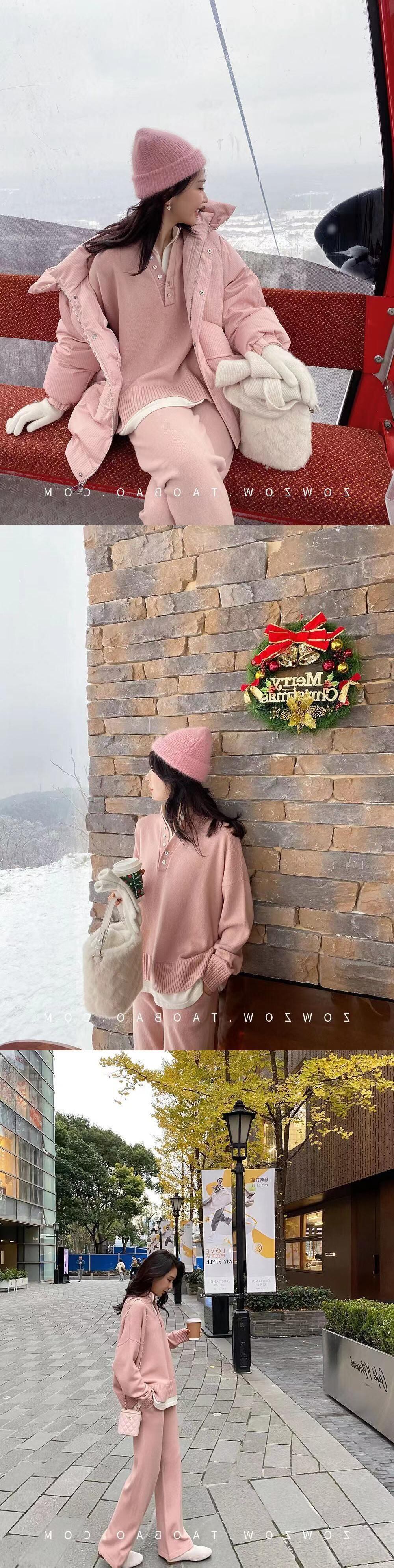 秋の 2 点セット プルオーバー長袖ピンク スタンド セーター トップ ルーズ ウエスト ワイドレッグ パンツ ニット スーツ ロング オータム 秋物 ワイドパンツ asa54360205125