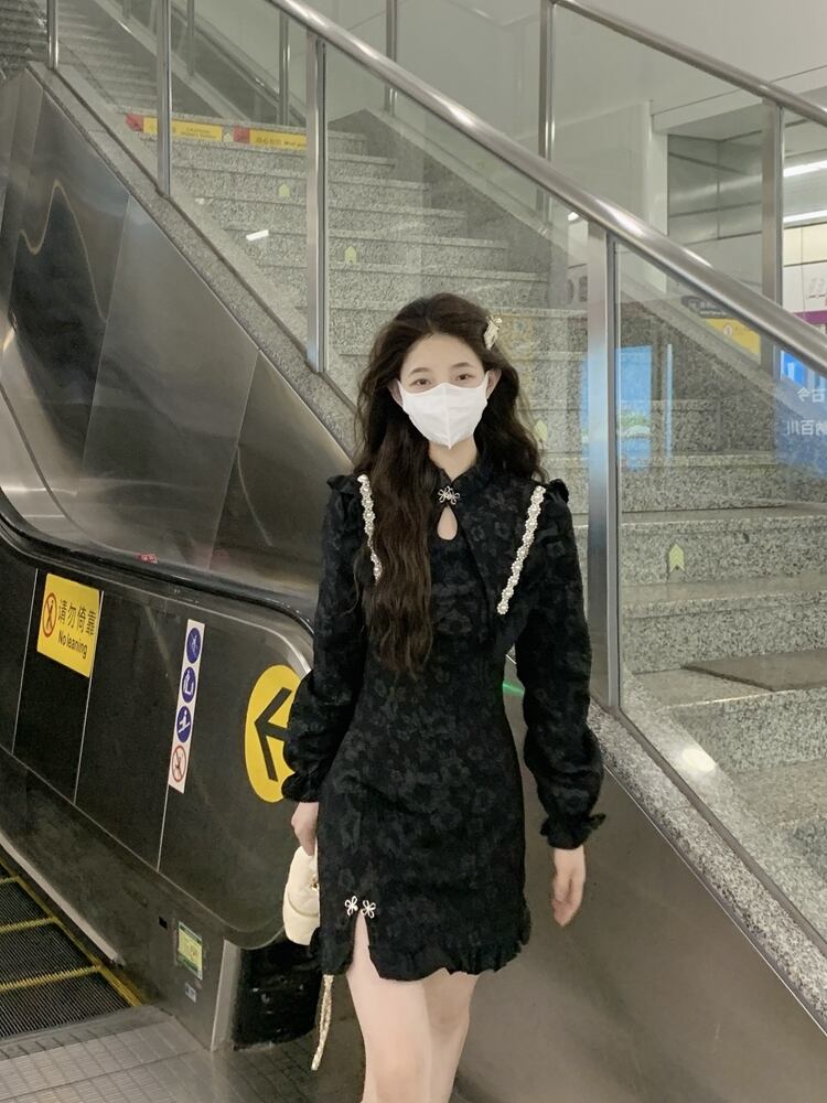 長袖黒チャイナ ドレス女性ミニ ラップ ヒップ ローブ Vestidos デ秋スリム ジャカード ロング ブラック オータム 秋物 asa63176904261