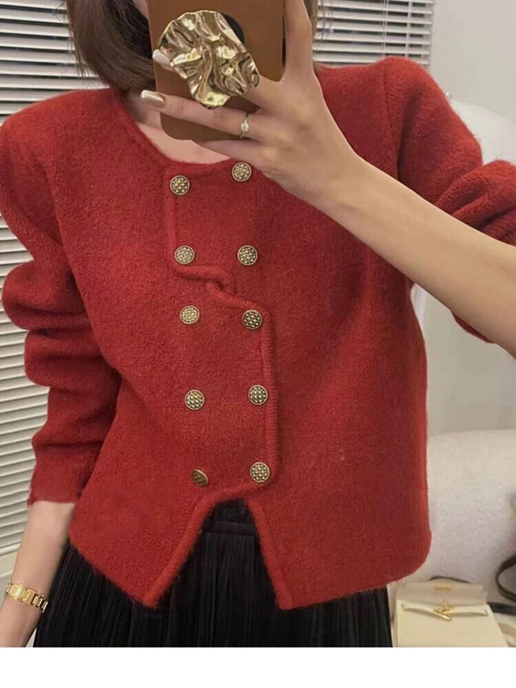 レッド クリスマス セーター スリム フレンチ イレギュラー ニット カーディガン ダブルブレスト アウター ジャケット レトロ シック 秋 asa66781983363