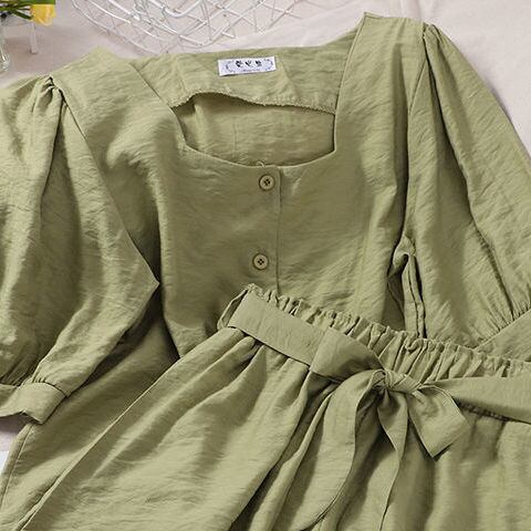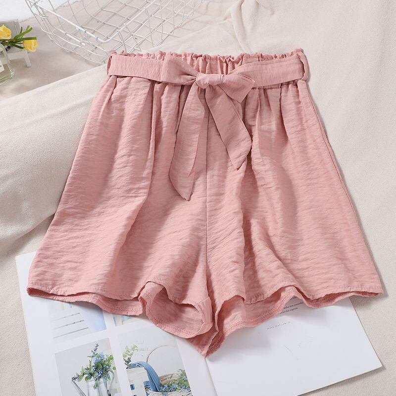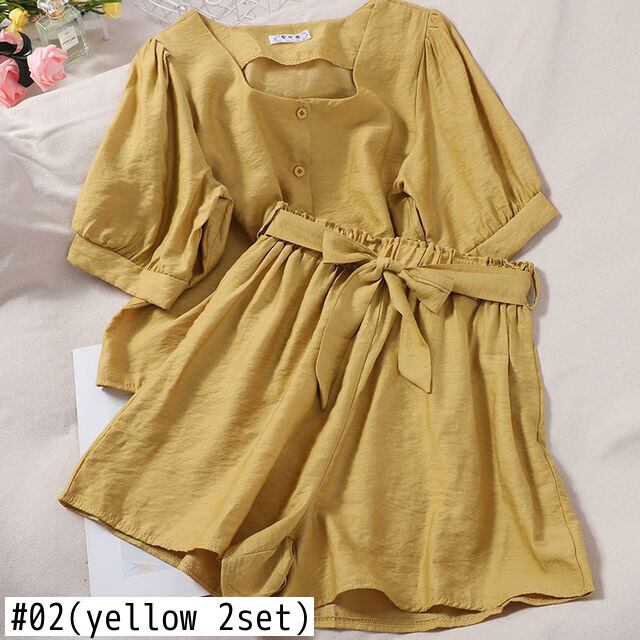 ピンクスクエアネックパフ半袖トップ夏の女性ブラウスワイルドシャツ 2 衣装弾性ウエストワイドレッグショーツセット ショート ハーフスリーブ エラスティック 伸縮 サマー 夏物 ブルマー ワイドパンツ スクウェア asa92297817895