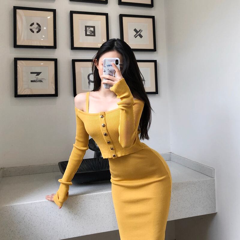秋ソリッドマッチングセットスリムパープルストラップラップヒップニットドレスミニスリム O ネック長袖ニットカーディガン薄いセーター ロング オータム 秋物 Oネック ソリッドカラー asa205573552