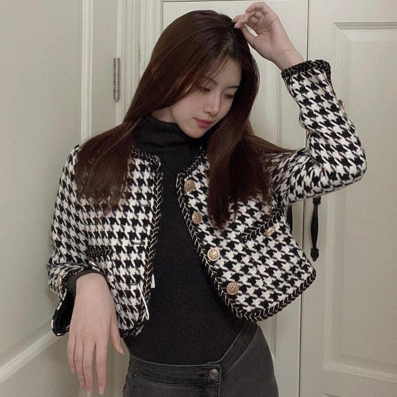 ショート黒千鳥格子コート Chaquetas 秋のセクシーな Jaquetas 冬のウールのジャケットの女性の格子縞の服 ブラック オータム 秋物 ウィンター 冬物 asa49549466002