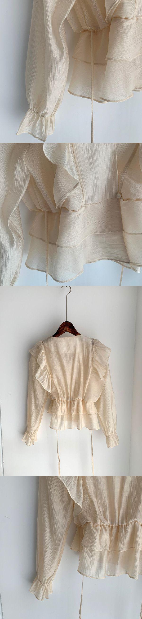 ガール フリル V ネック シフォン シャツ女性ウエスト クロップ トップス OL 春透視ブラウス Roupas s スプリング 春物 Vネック asa23811128174