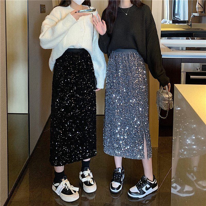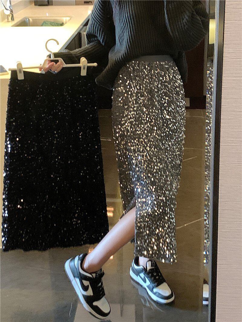 ワイルドウエストスリムブラックスパンコールスカート女性 A ラインロング Faldas Largas Y2k スカートグレー春 スプリング 春物 Aライン asa61137507437