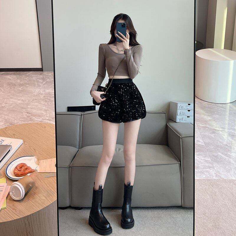 春弾性ウエスト黒スパンコールショーツ Pantalones Cortos デウエストショーツ Feminino ワイドレッグ Y2k セクシーなレトロ ブラック エラスティック 伸縮 スプリング 春物 ブルマー ワイドパンツ asa41186929276