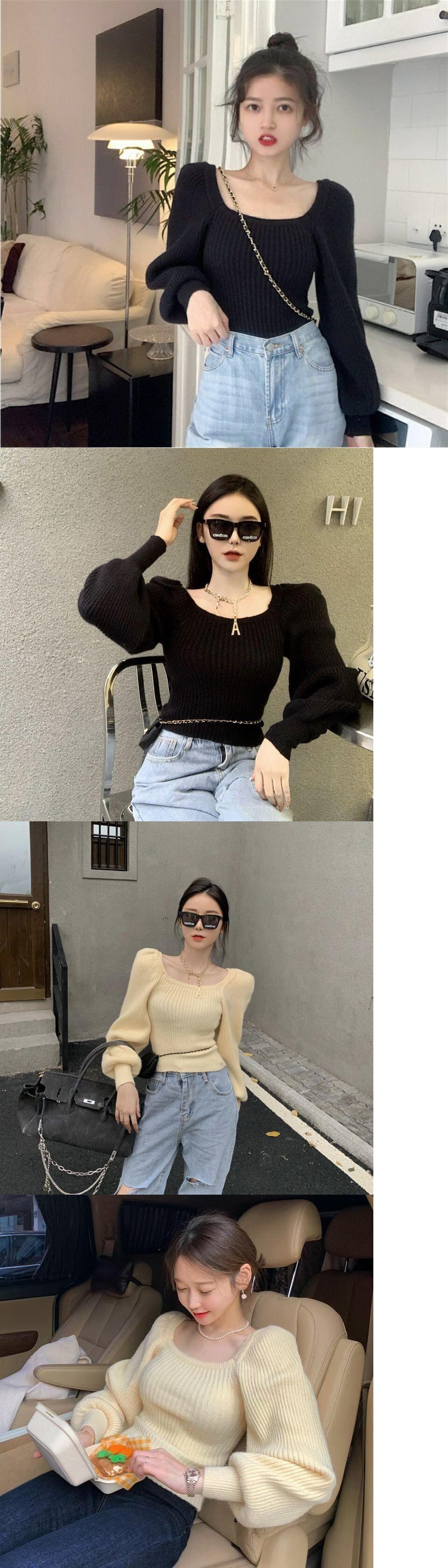 プルオーバー クロップド スクエアカラー セーター シック セーター ランタン パフスリーブ ジャンパー ニット アウター トップス スクウェア asa81078750007