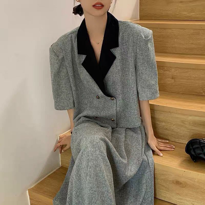 ノッチ付き半袖ダブルブレストシャツ女性スーツパフブレザーカーディガンウエストプリーツスカートセットジャケット ショート ハーフスリーブ asa36736602509