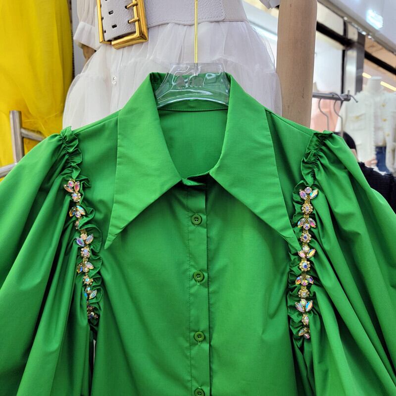 プリーツ パフ スリーブ ダイヤモンド チェーン イレギュラー シングルブレスト シャツ De Blusa 服 グリーン トップス ブラウス asa37596357813