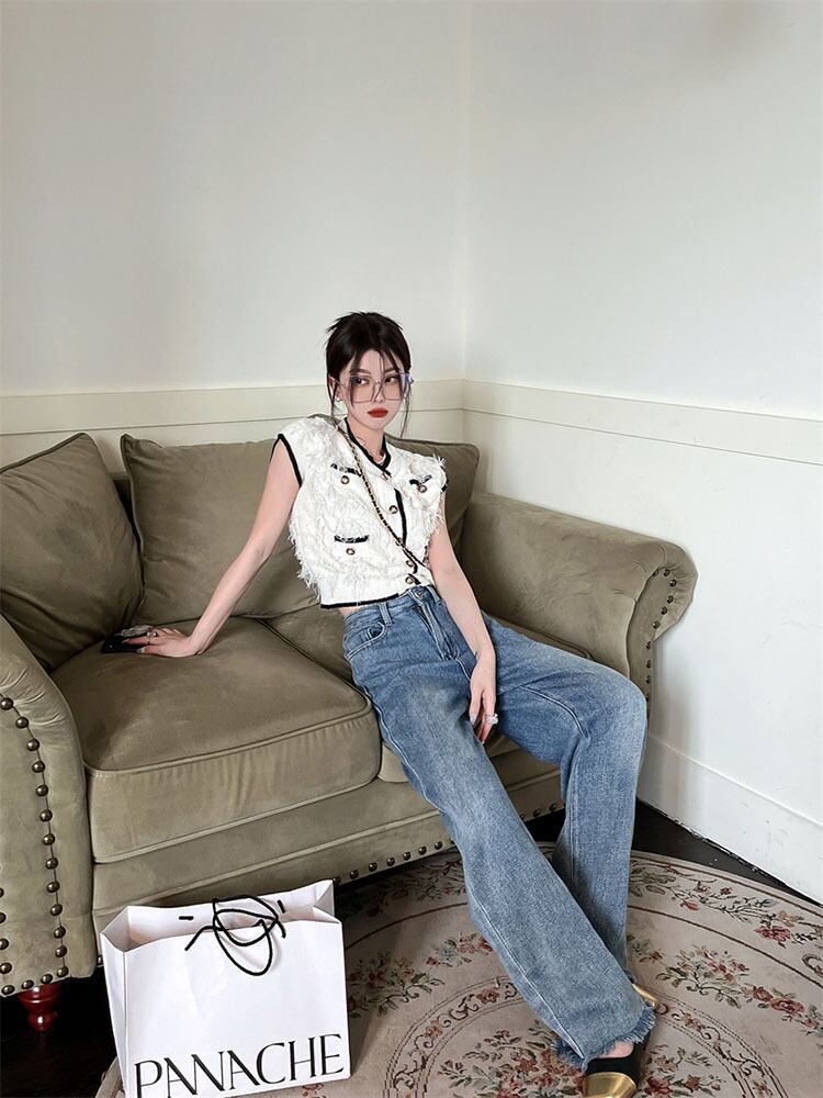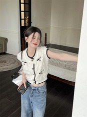 ラウンド ノースリーブ カーディガン ニット ホワイト テル ベスト ジャケット シック ジェントル スリム クロップ トップ シングルブレスト シャツ asa99570839288