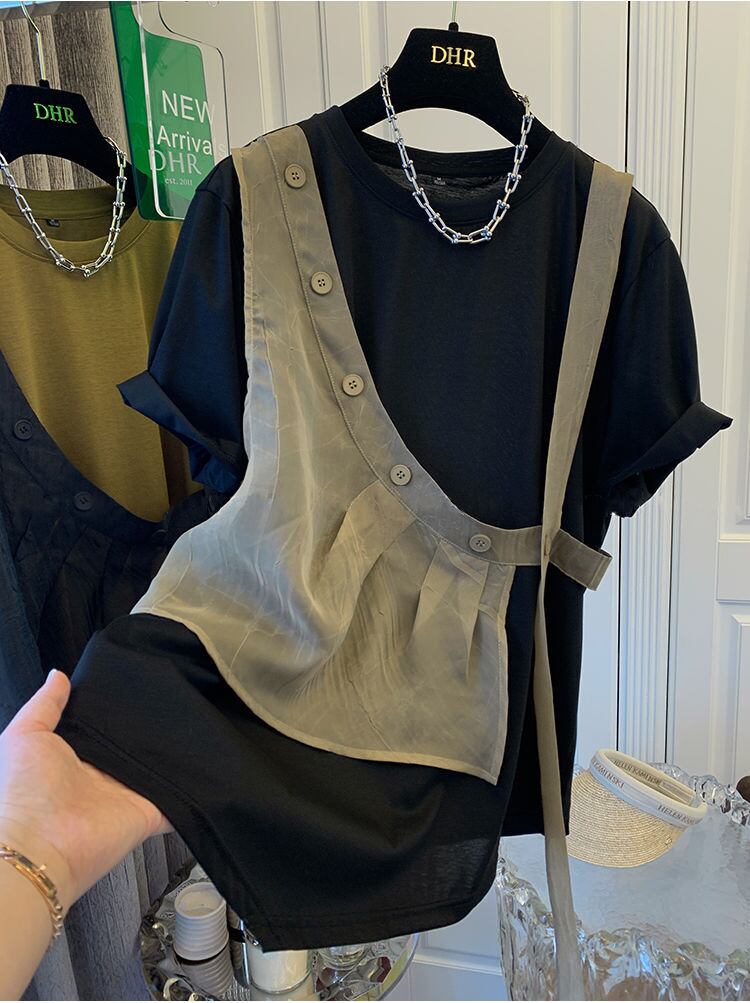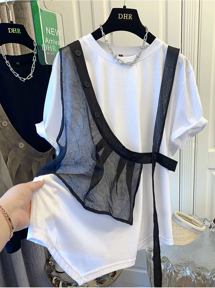 美的服グラフィック Tシャツプリーツメッシュベストフェイクツーピース不規則な半袖 Tシャツ女性黒 Tシャツトップス ショート ブラック ハーフスリーブ asa71142369399