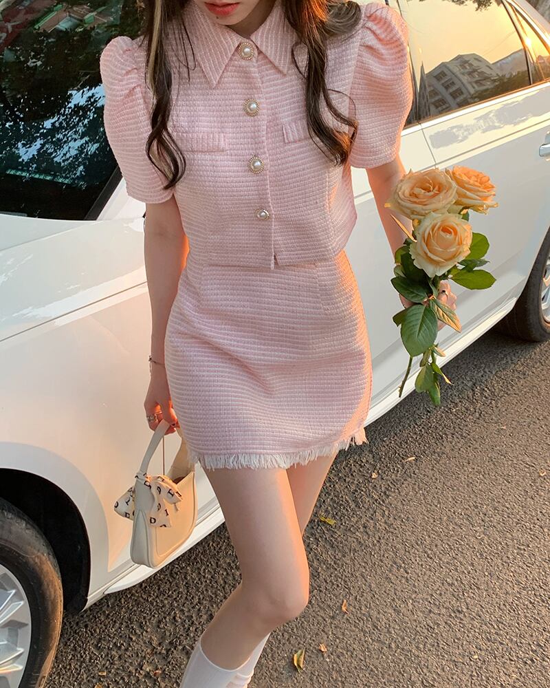 甘い気質ピンクパフスリーブラペルコート女性シングルブレストショートジャケット夏ミニスカートマッチングセットシック 大人ガーリー スウィート キュート カジュアル サマー 夏物 asa67332845132