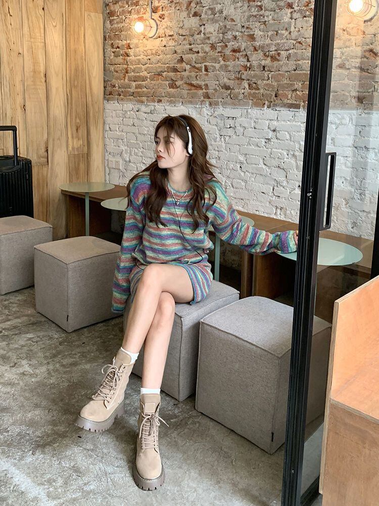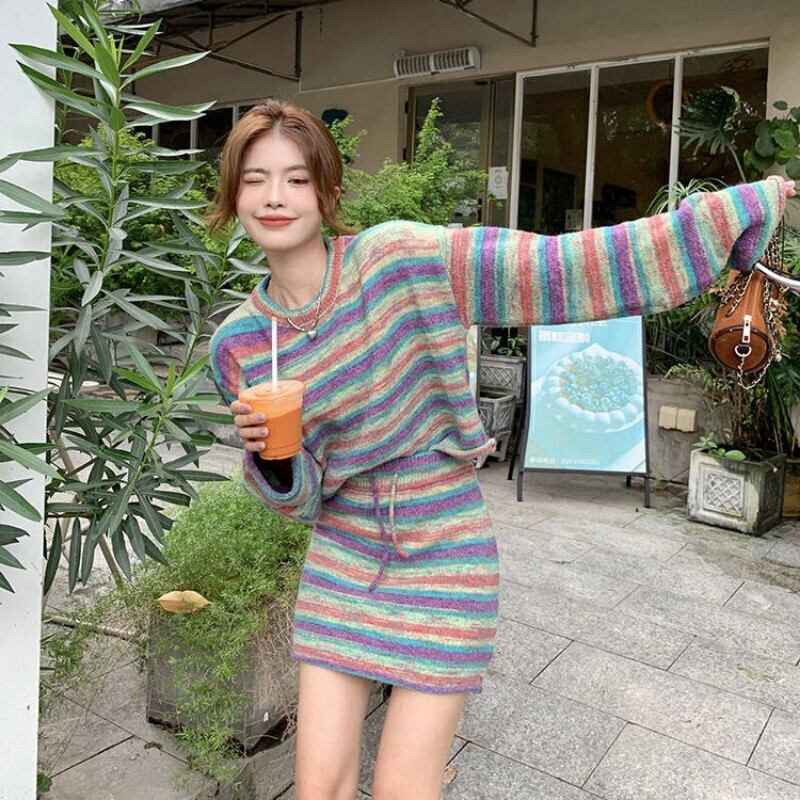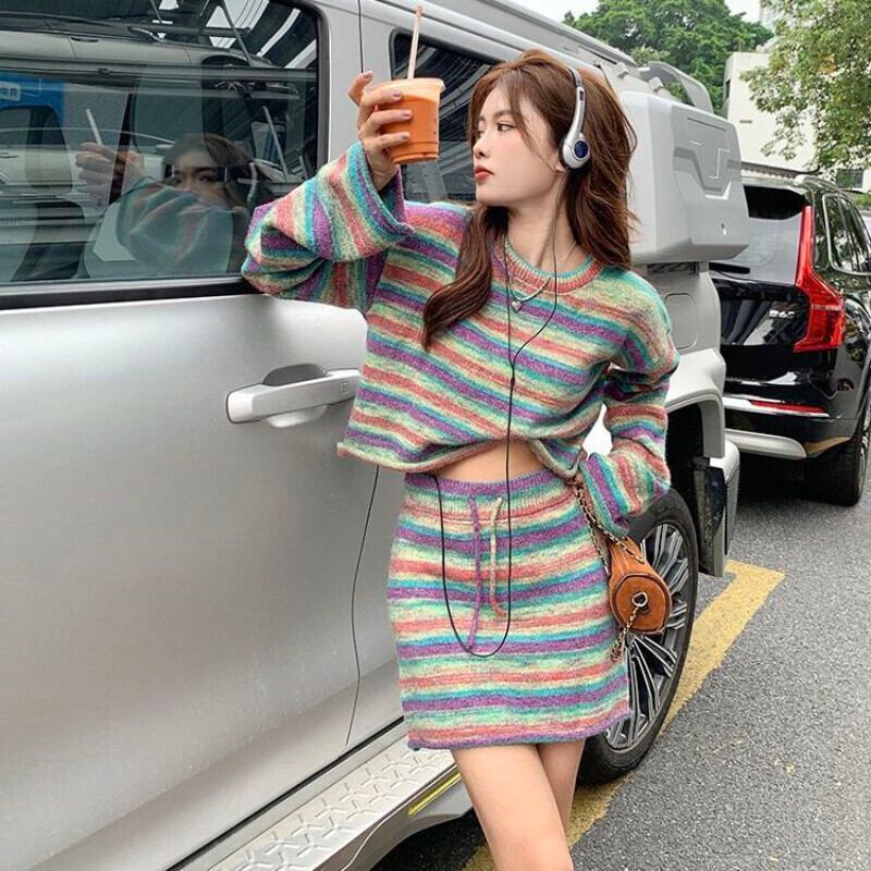 クロップドレインボーセーターミニ巾着スカート Y2k セクシーなストライプセータートップス 2 点セットレディース衣装ニット asa84640828916