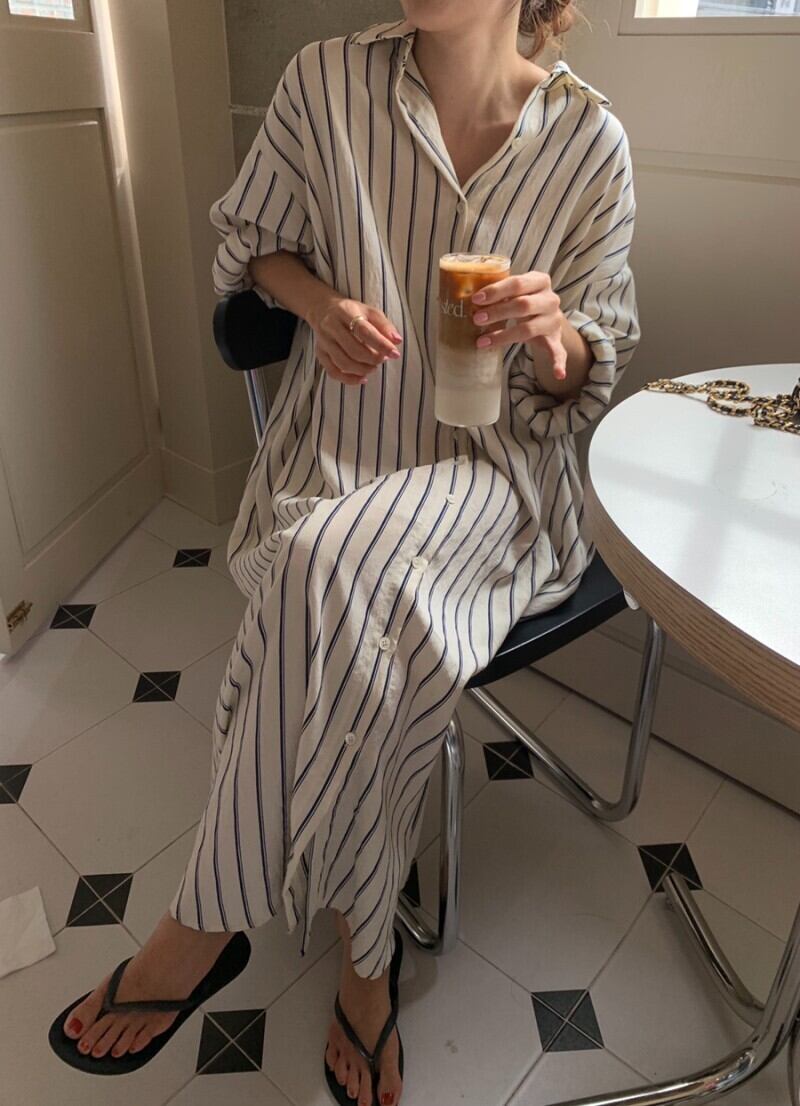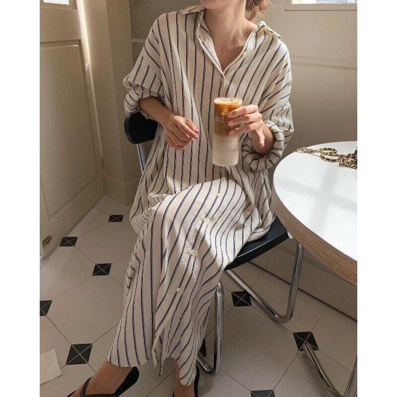 ストレートシングルブレストラペルストライプシャツドレス女性の春ミディレトロワイルド Vestidos デルーズレディドレス スプリング 春物 asa63999150682