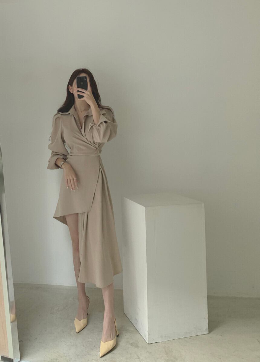 スリム春レトロ気質カーキ不規則な長袖シャツドレス女性プリーツ Vestido Feminino 黒 OL ミディロング ブラック スプリング 春物 asa80611083873
