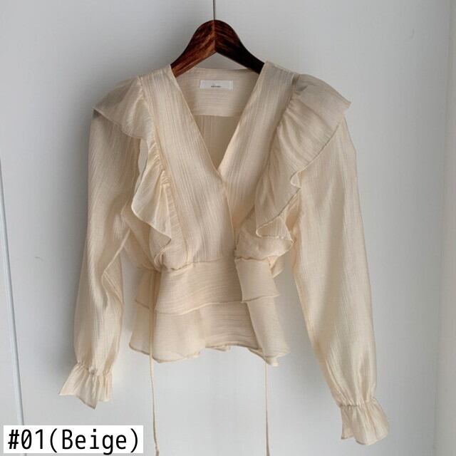 フリル V ネック レトロ スリム ウエスト クロップ トップス透視シフォン シャツ レディース OL ブラウス シャツ Vネック asa23192960645