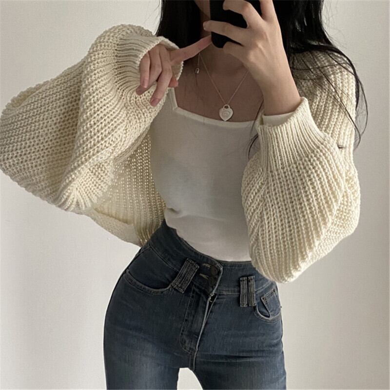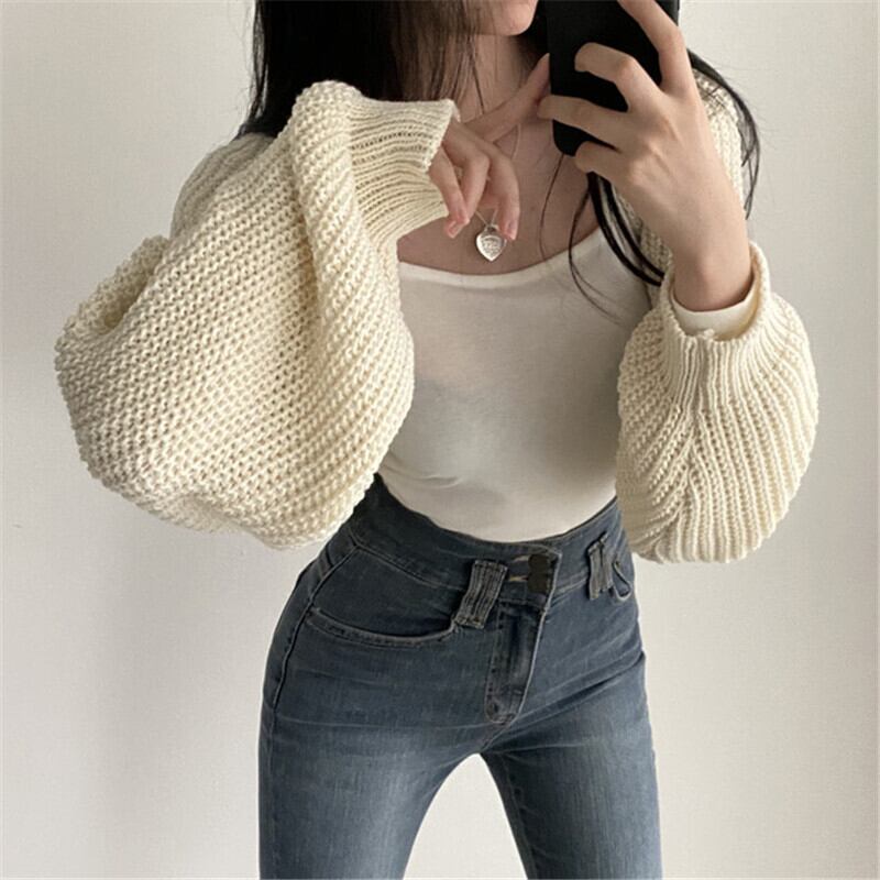 気質ランタンスリーブニットショールコート春ワイルドセクシーなショートグレーセーターニットクロップドカーディガントップス Y2k 女性 スプリング 春物 asa35134528937