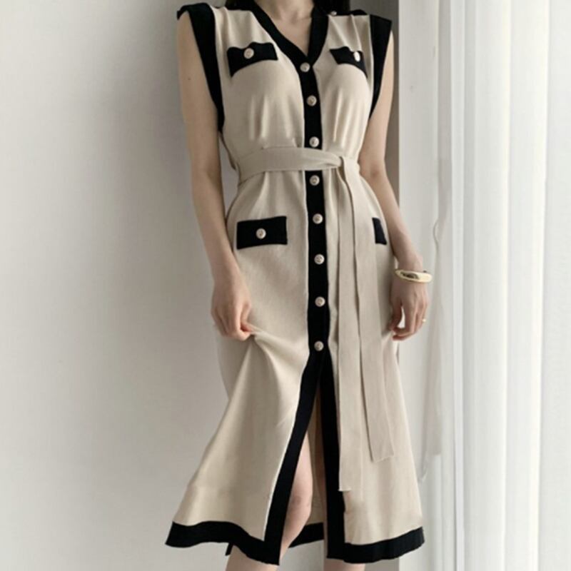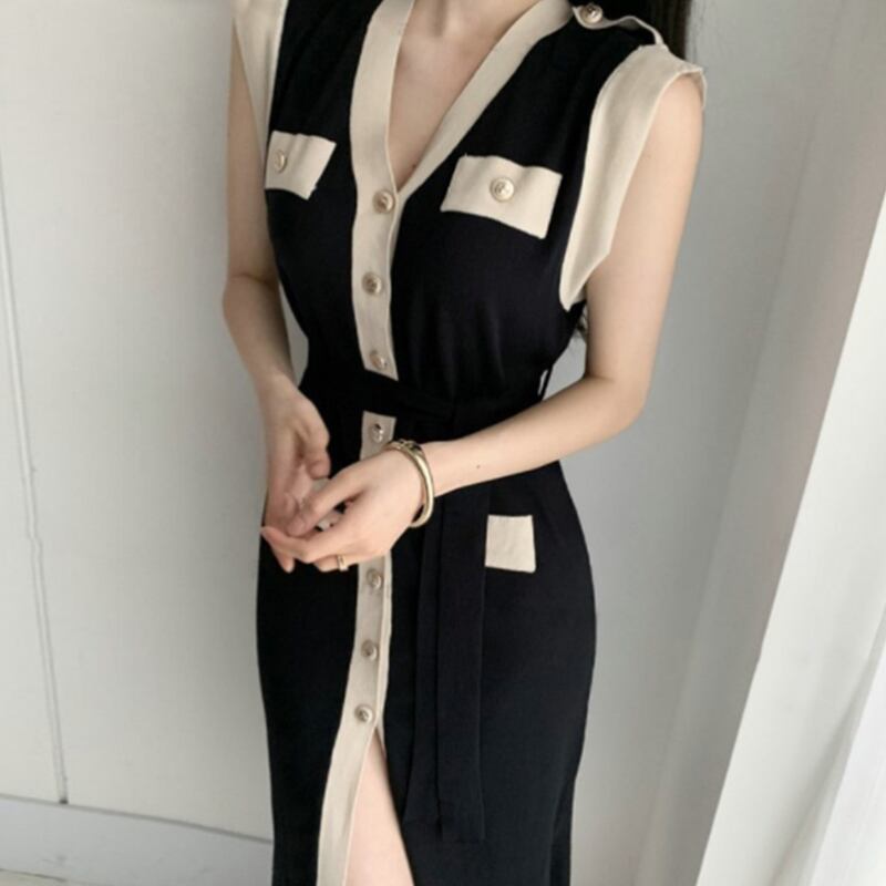 V ネックメタルシングルブレストベルトウエスト黒ノースリーブベストドレス女性ロング Vestidos ニット Y2k ドレスローブ ブラック ハーネス asa544195106
