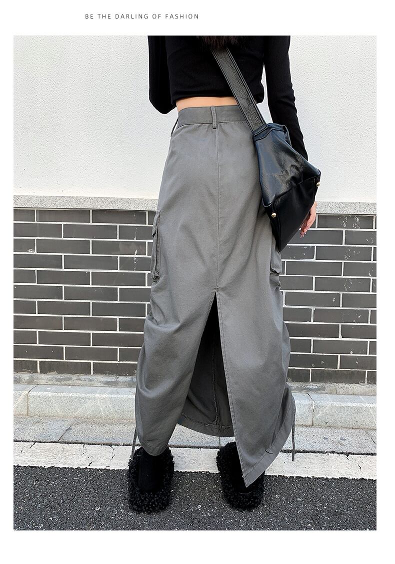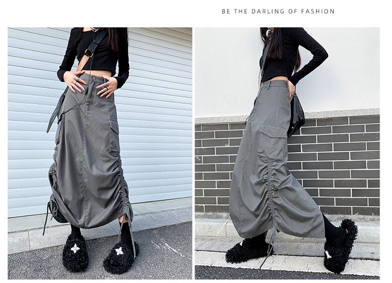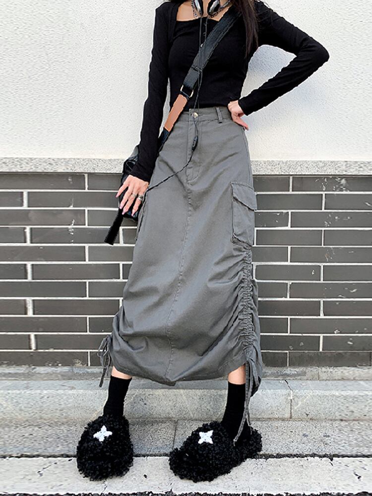 ミリタリー グリーン イレギュラー カーゴ スカート Y2k ファルダス ラルガス ミディ ロング バック スプリット グレー ドローストリング スカート ペチコート 秋 オータム 秋物 asa93990530650