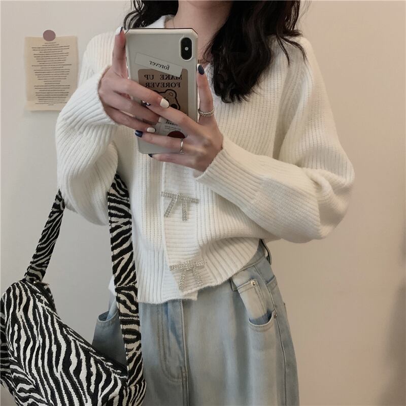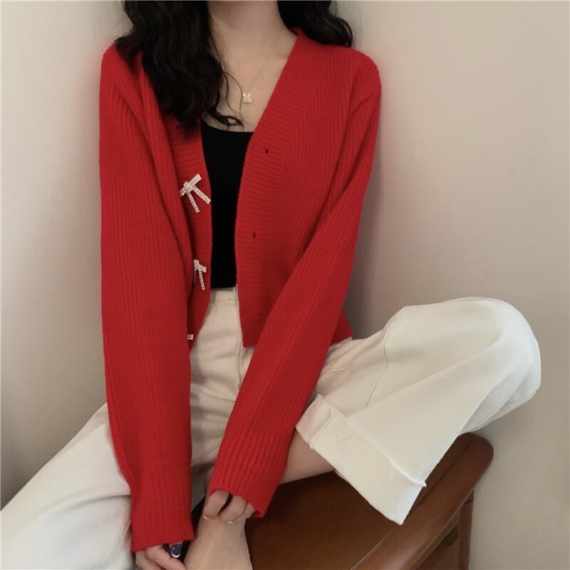セーター秋 V ネック完全な赤ニット カーディガン ショート スリム衣装ボウ ダイヤモンド シングル ブレスト ニットウェア トップ ジャンパー レトロ レッド リボン オータム 秋物 Vネック asa72044299204