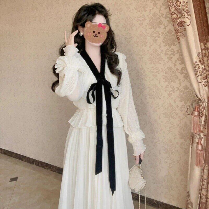 レースアップ V ネック白プリーツドレス女性ローブ春スリムフリルドレス A ライン Vestidos 気質シフォン OL ホワイト スプリング 春物 Vネック Aライン asa69925051500