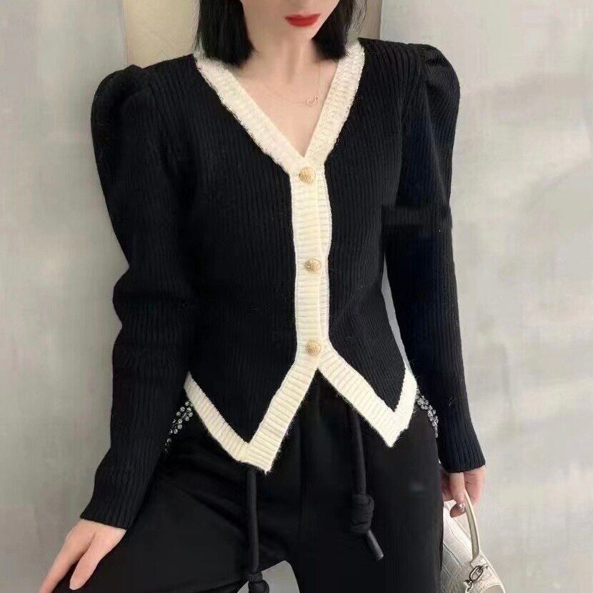 コントラストルーズトップフレグランスコート気質パフスリーブニットカーディガン黒不規則なセーター女性ジャケットシャツ ブラック asa67046953084