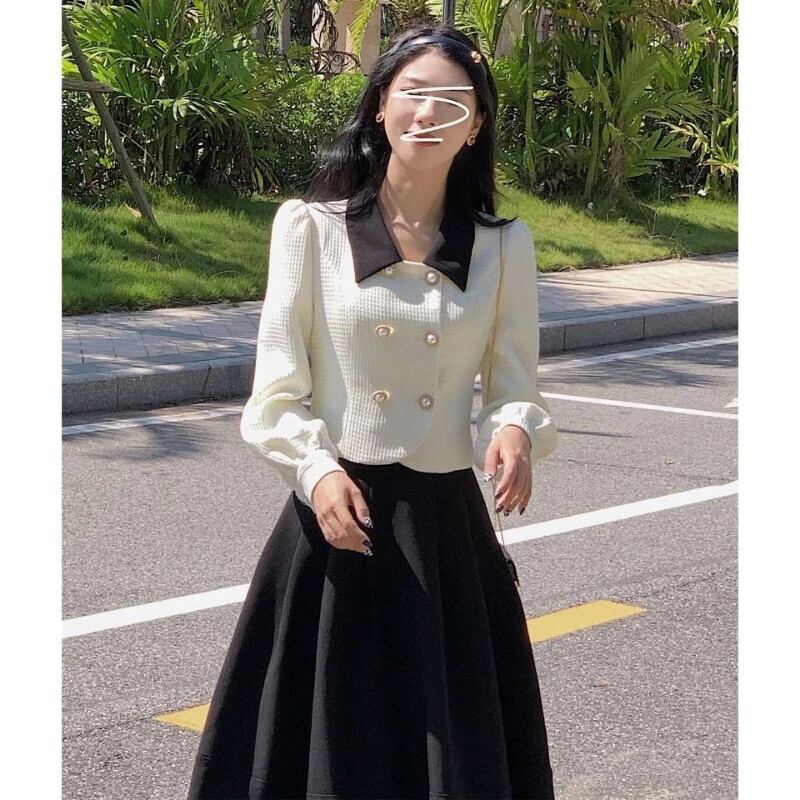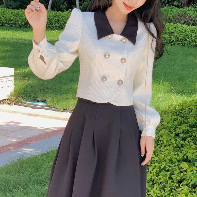 スカートスーツブレザー仕立てコートパールダブルブレストシャツ女性トップ黒プリーツスカートセット春 OL ブラウスシャツ レッド ブラック スプリング 春物 真珠 asa28400283150