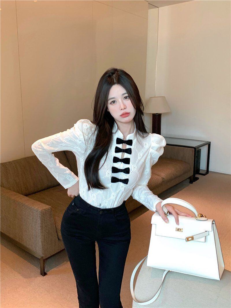ブラウス女性スリムフレンチちょう結び長袖白レースシャツトップス春刺繍シャツレディ ロング ホワイト リボン スプリング 春物 asa89870554773