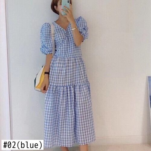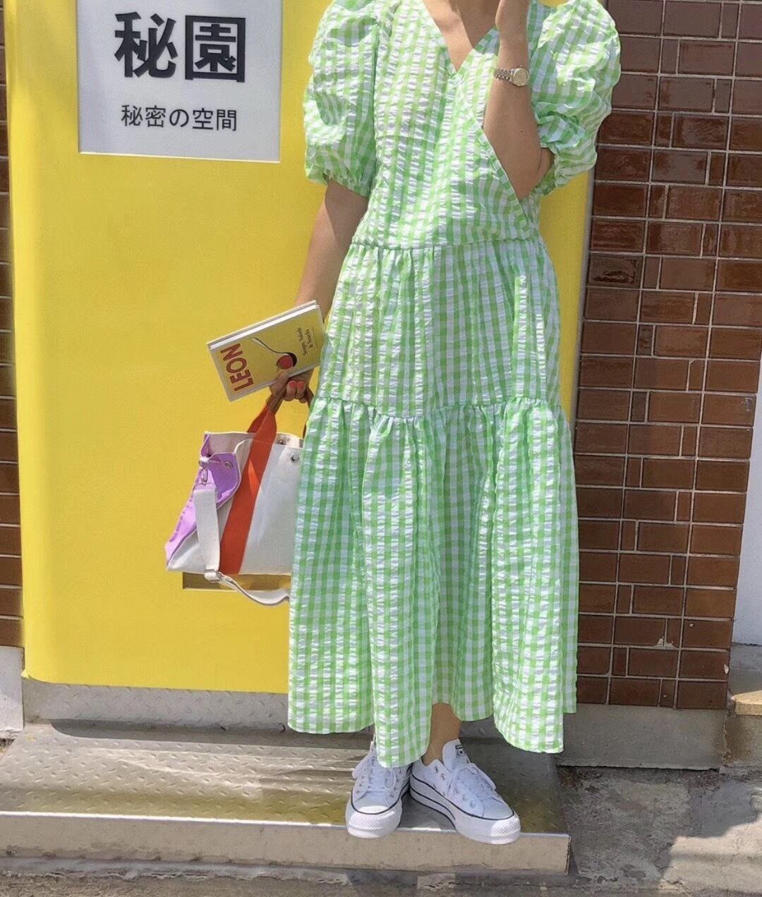 シックな夏の新鮮な気質 V ルーズバブル半袖女性の緑の格子縞のドレス Vestidos 女の子 ショート ハーフスリーブ サマー 夏物 グリーン asa64851350914