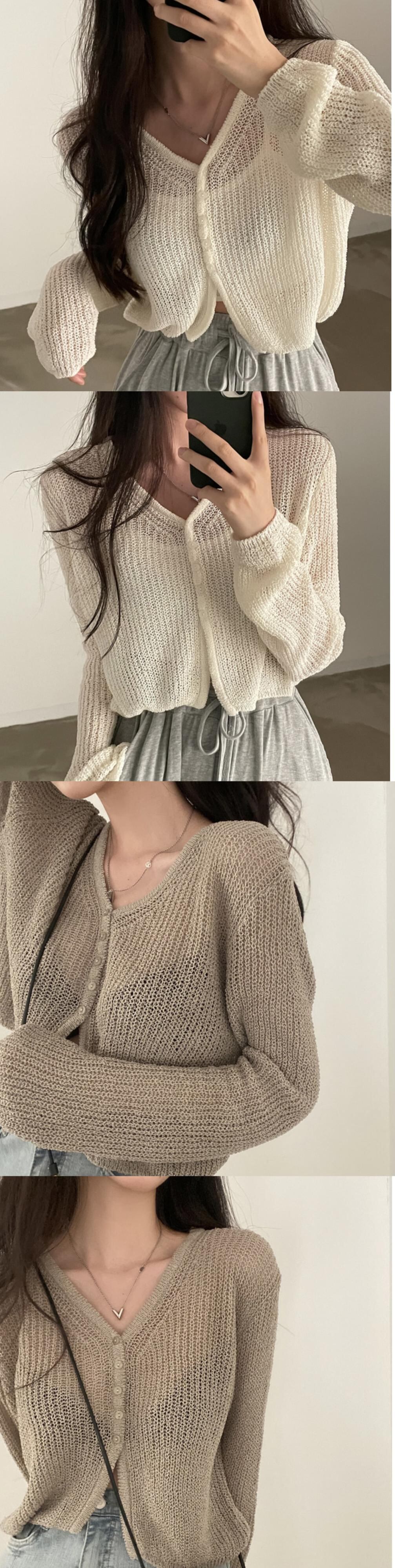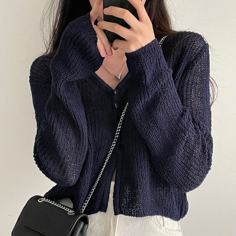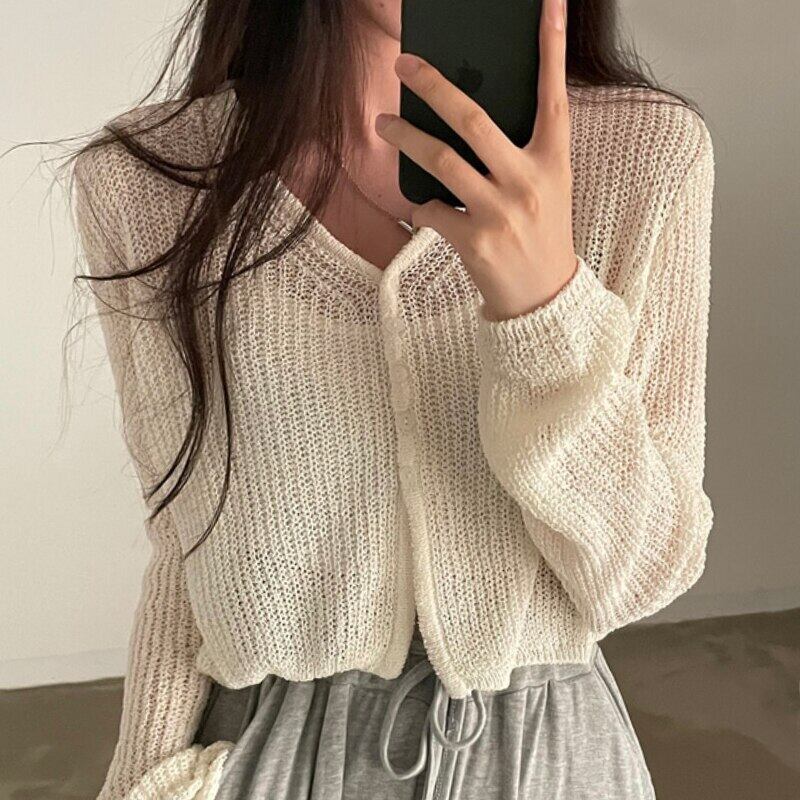 Vネックルーズシングルブレスト中空アウト長袖ショートパースペクティブセーター女性ソリッド日焼け止めシャツクロップドカーディガン ロング ソリッドカラー asa45914789385